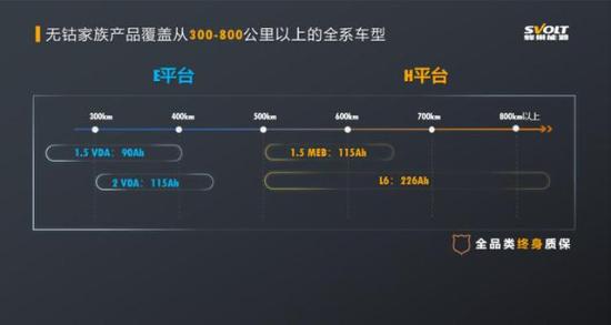 蜂巢能源H平台和E平台所生产的无钴电芯,对应的是不同的车型定位市场,覆盖从300-800公里以上的全系车型,可实现从A00-D级车型上的全场景应用,并支持全品类终身质保。