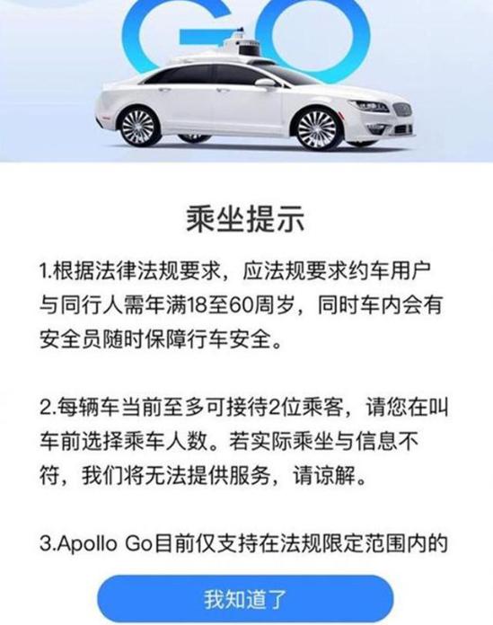 另外,从百度地图自动驾驶叫车服务的乘坐提醒来看,目前只支持在法规限定范围内的推荐站点上下车,每辆车同一时间最多可接待2位乘客,并且要求乘坐人需年满18至60周岁。另外,为了全面保障安全行驶,车内配备有安全员随时应对紧急情况。小伙伴们,赶紧去体验一下吧!
