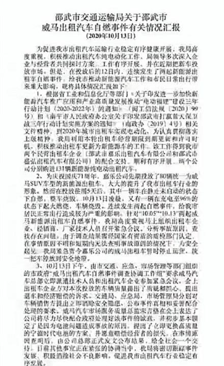 各位大佬们,还记得前段时间威马电动出租车投放后分别在10月5日、13日发生两起自燃事件吗?10月5日,福建一辆威马EX5电动车,在路边发生了自燃起火事件。但在10月13日凌晨,又有一辆威马电动车在充电时发生了自燃起火,整车被严重烧毁。半个月不到,就已连续发生了两起自燃起火事故,让很多观众都对威马的安全性产生质疑,10月13日,福建邵武市交通运输局发布威马电动出租车连续两起自燃情况通报,为安全起见,暂时停止威马电动出租车运营,统一把车停放到安全地带。