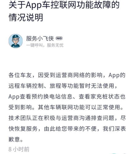 10月16日早,有大量蔚来和小鹏车主在自家APP、微信群中反应,车子出现断网现象。这个“断网”跟我们手机断网出现的问题差不多,即车子能正常驾驶,但车机系统的在线音乐、实时导航之类的依赖网络的功能则无法正常使用。