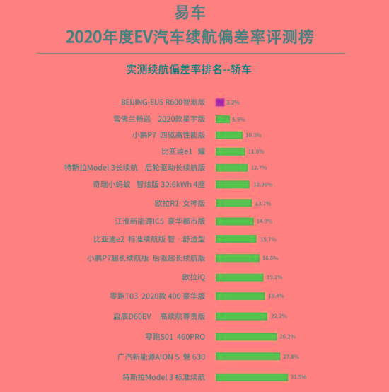 在易车近期推出的《EV汽车续航偏差率评测白皮书》中,BEIJING-EU5以3.2%的续航偏差率位列轿车组第一,这表明其实际续航里程最为接近官方公布的NEDC工况续航里程,也再度验证了其多年来在市场上树立的续航真实的口碑。