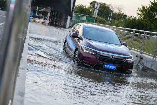 而在涉水路段驾驶时,自己在确认驾驶车辆的离地间隙的前提下,通过观察前方同类型的车能通过时,自己稳住油门慢速通过积水路段即可,不能采用一脚油门往前冲或频繁地轻点油门的方式进行驾驶,譬如笔者发现涉水深度在轮毂车标以下,以及前方车辆能顺利通过时,开着皓影稳住油门缓慢通过了涉水路段。