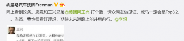针对王兴的言论,威马汽车沈晖表示不服并作出正面回应,并表示愿意与王兴“打赌”。威马汽车CEO沈晖则认为,威马一定会是Top3之一,愿意与王兴打个赌。最后还附加了一句,我也看好理想。最后还艾特了理想汽车CEO李想。好人做了,还把自己肯定了!一举两得。