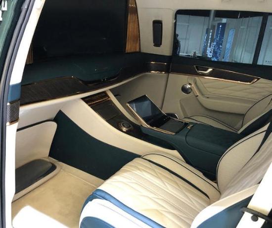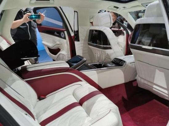 当然对于加长版车型来说后排才是重中之重,我们能够发现它的后排是非常奢华的,两个航空级别的座椅带有腿托的功能,同时还有按摩,加热,通风,以及半躺的功能,在中央扶手的地方有一个小的屏幕,可以控制车内的多媒体功能,以及座椅的调节,此外在车内还配备了红酒杯。