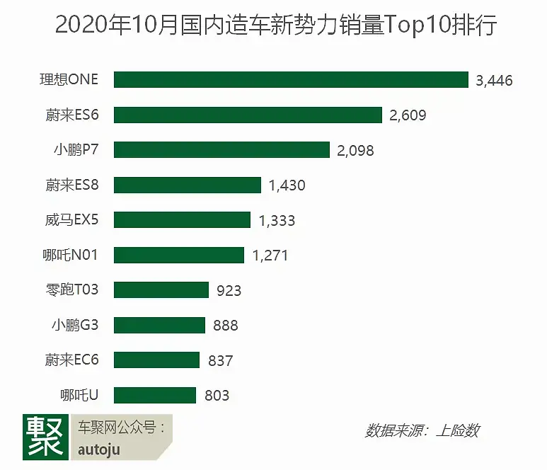 最后,再奉上10月中国造车新势力车型销量Top10,其中理想ONE销量(3,446)登顶,其次是蔚来ES6(2,609)和小鹏P7(2,098),销量均过2000辆;第4-6位的蔚来ES8(1,430)、威马EX5(1,333)、哪吒NO1(1,271),销量均过1,000辆。