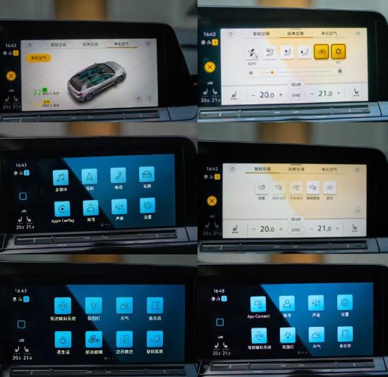实拍车型采用了当下流行的双联屏的设计,由10.25英寸液晶仪表以及10英寸中控屏组成。其中,全液晶仪表的界面显示变得更加扁平化,不同驾驶模式的配色有所不同,这在仪表和中控屏中是同步变化的。这款中控屏采用了卡片式的UI设计,搭载的是大众最新的MIB 3系统,搭载了在线导航、无线CarPlay、语音识别、智能家居以及应用商城等功能配置。