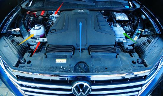 红色箭头:全新途锐eHybrid车身焊接的防火墙和前部焊接采用全铝材质