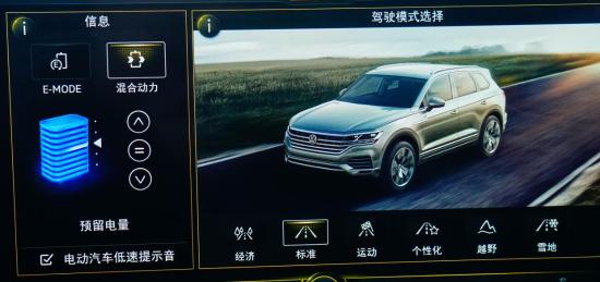 在中央显示屏中可以调取能量分配选项,并在E-MODE(全电驱动)和混合动力(油电混合驱动)两种行车状态进行切换。在E-MODE状态,全新途锐eHybrid就是依靠来自三元锂动力电池输出的电量,当电量耗尽(达到整车控制系统认定的低电量阈值)自动切换至混动动力模式强制进行怠速发电或行车发电。在混合动力状态,车辆能够根据预设的经济、标准、运动、个性化、越野和雪地等不同的驾驶模式以及由此带来的不同前后驱动桥扭矩分配比例、油门踏板深踩程度等因素进行综合能量(来自发动机的扭矩与来自电动机的电量)的实时在分配。