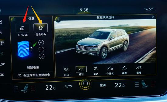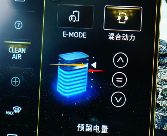 上图显示的途锐eHybrid动力电池电量处于红色箭头所指的状态。通过白色箭头,将动力电池电量升至黄色箭头所指的高位,此时途锐eHybrid处于预留电量模式,由于动力电池电量没有低于最低阈值,车辆会通过“行车充电”将动力电池电量提升至预设状态,而不会通过“怠速充电”进行强制充电。