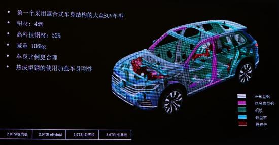 来自进口大众官方发布的信息看,第三代途锐(包括燃油版和eHybrid版)的车身采用由不同类型的钢材质与铝材质混合而成。采用铸造工艺的铝材质用于驾驶舱与动力舱之间防火墙下端(两侧)和后后悬架的下摆臂。自重较轻、强度更高的热成型钢则应用于A柱、B柱以及车顶两端,以提高来自侧面撞击时的驾驶舱的被动安全性。自重最小且不用承受冲击力的铝材质多用于前机盖、五门车门外蒙皮等覆盖件。