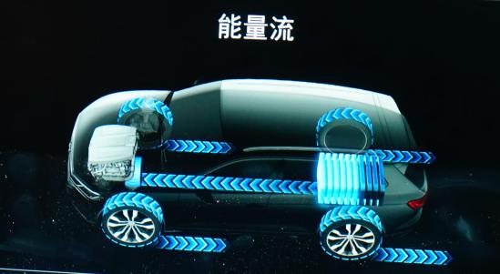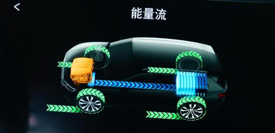 在中央显示屏可以读取油电混合+预留电量模式下车辆在长下坡时,“带档滑行”造成的驱动电机反转进行逆向充电(绿色能量流为模拟轮胎旋转反向传递扭矩至驱动电机,蓝色能量流为驱动电机向动力电池充电)。