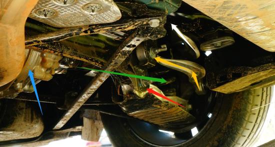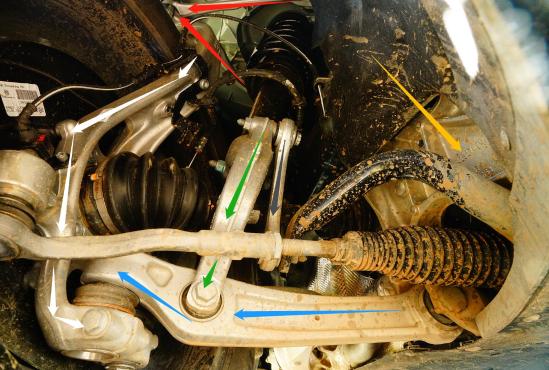 绿色箭头:前减震器总成下端的铝材质拉杆