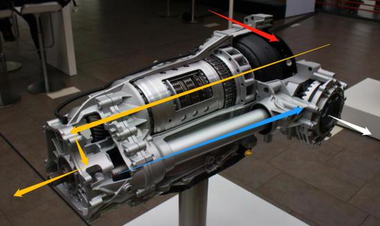 黄色箭头:从2.0 TSI发动机输出的动力8AT以及中央差速器至后驱动桥的扭矩传递路径