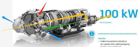 蓝色箭头:2.0 TSI发动机扭曲轴输出端串联1组驱动电机,驱动电机后端设定1台8AT,构成1套标准的纵置并联PHEV驱动技术架构