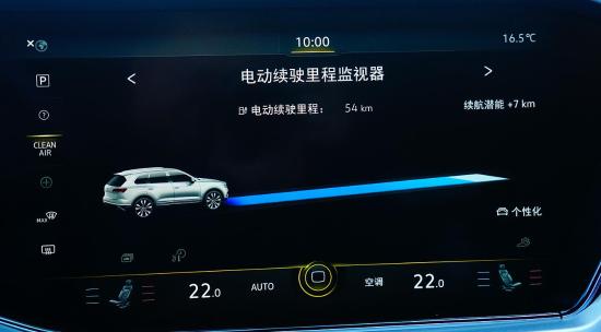 在E-MODE状态,全新途锐eHybrid全电驱动NEDC续航里程为54公里,当然这是一个较为理想化的数据。实际全电续航里程还要根据室外温度、单程续航力距离、驾驶习惯以及道路拥堵状态比对。