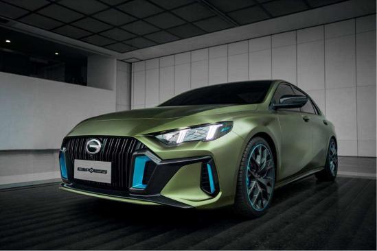 进气格栅两侧则是用亮蓝色挑出了两个进气口,据广汽方面称,前脸的设计灵感来源于"战机",这两个开口像极了战机机腹的进气口。颜色和材质的使用显得十分精致。