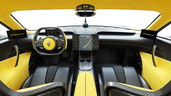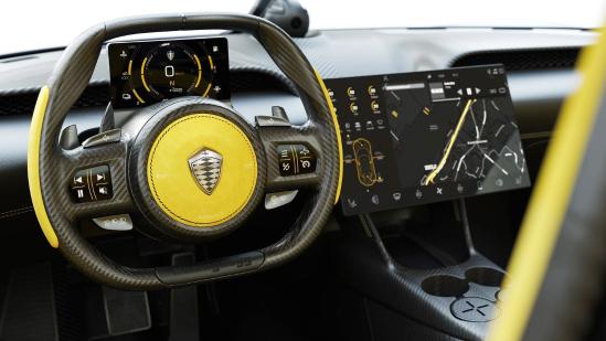 此外,Gemera前排拥有6块液晶屏,其中包括2块电子后视镜、1块全液晶仪表、1块13英寸中控屏。甚至连方向盘左右两侧的多功能按键,都是全液晶触控屏操作!