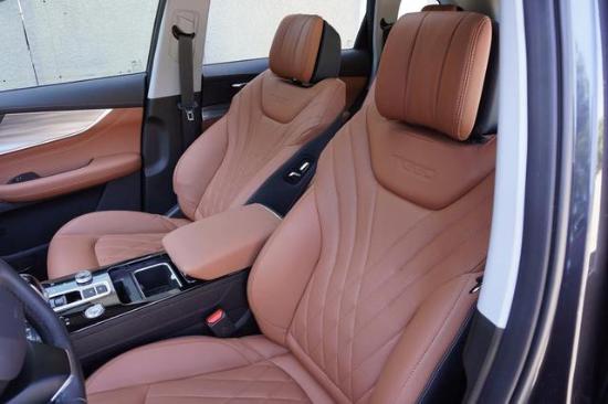 其浅棕色真皮座椅采用花式浪缝工艺设计,除了拥有好的立体视觉外,乘坐舒适性和支撑度也非常好,据奇瑞厂家介绍该座椅采用双硬度发泡工艺以及舒适型海绵层设计。