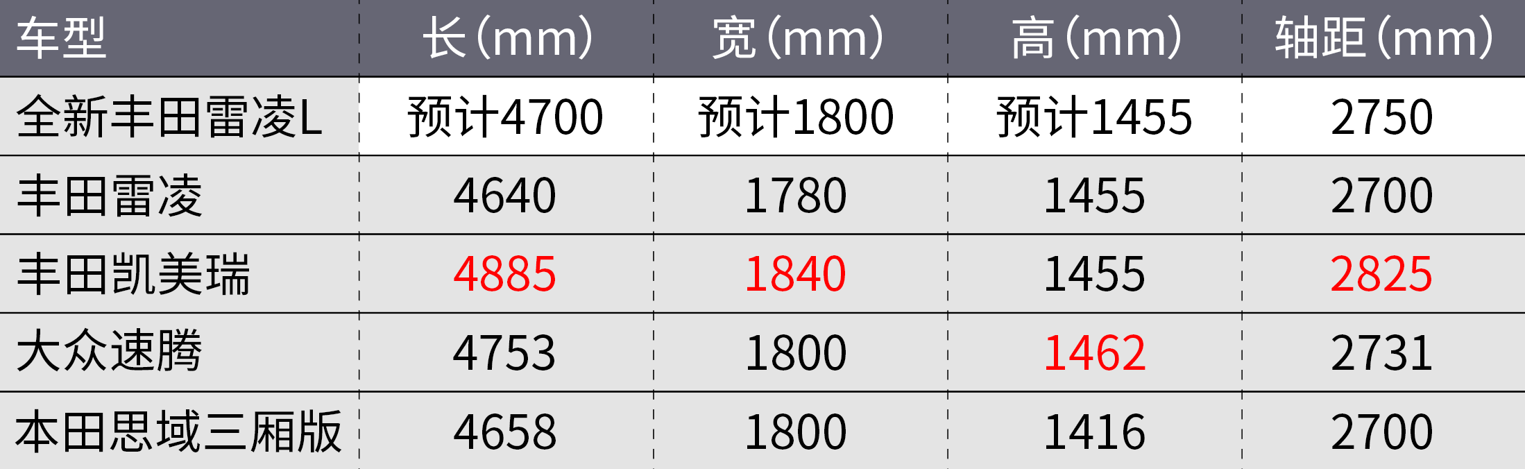 尺寸方面,新车在轴距方面比雷凌/卡罗拉加长了50mm,达到2750mm,预计车长将超过4.7米,宽度有望达到1.8米。