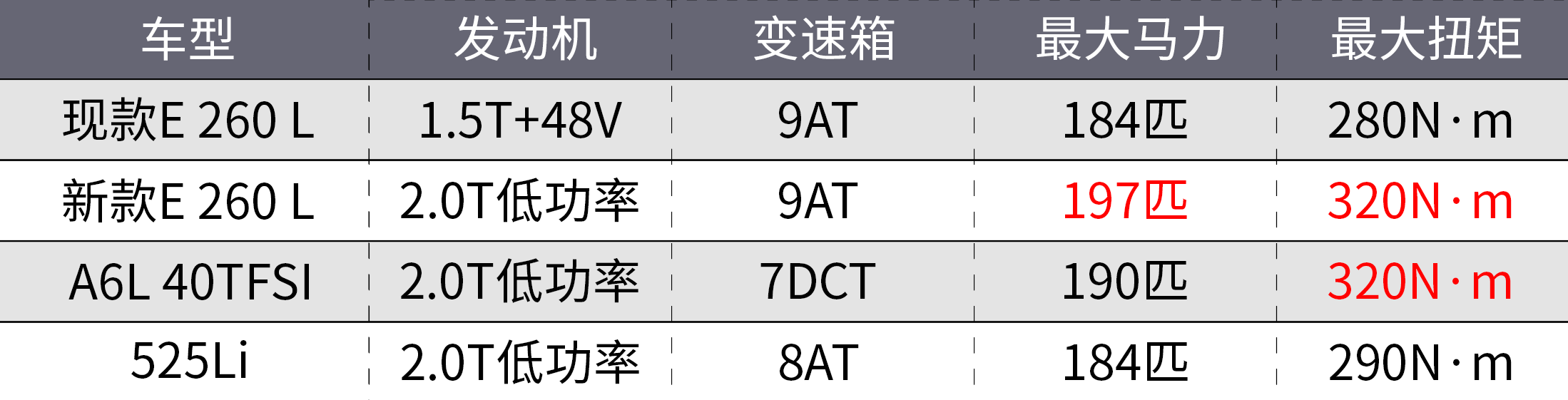 这代奔驰E级凭借其优雅大气的外形以及豪华感十足的内饰,获得了相当出色的销量。但目前在售的入门版车型E 260 L,由于1.5T+48V动力系统在排量上的劣势,最终在40万价格区间上,E级的竞争力要弱于搭载2.0T发动机的A6L 40TFSI以及525Li。当下,北奔显然也意识到了这个问题,遂决定对E 260 L的动力进行一次升级。
