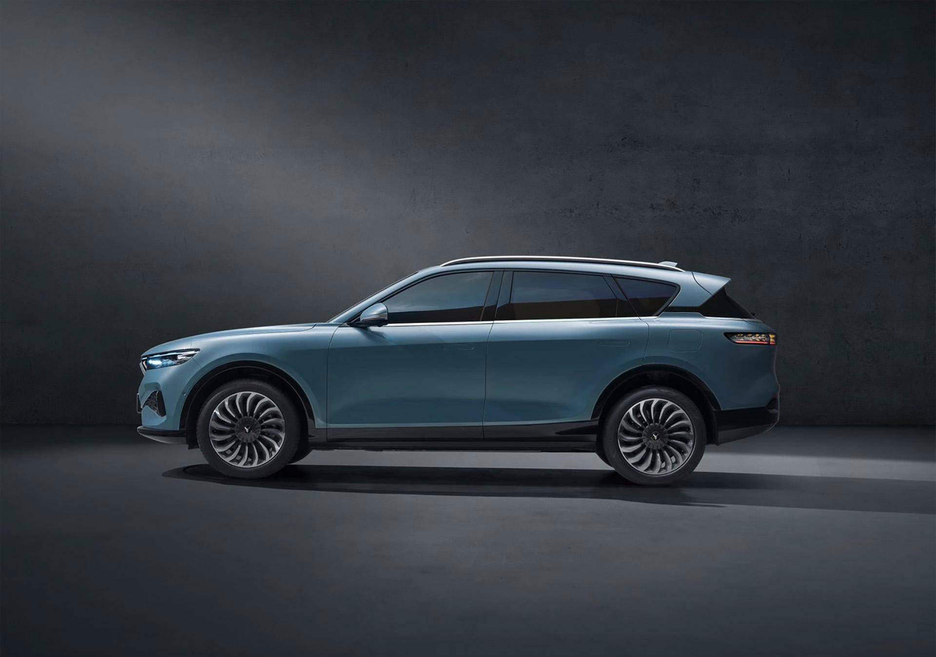 侧面来看,新车遵循了时下主流的曲面式豪华设计风格,并采用了隐藏式门把手的设计,底部搭载了大尺寸的多辐式轮毂,配合轮眉处以及侧面底部的凹凸面,更具力量感。值得一提的是,根据官方披露的消息,新车的轴距已经超过2.9米。