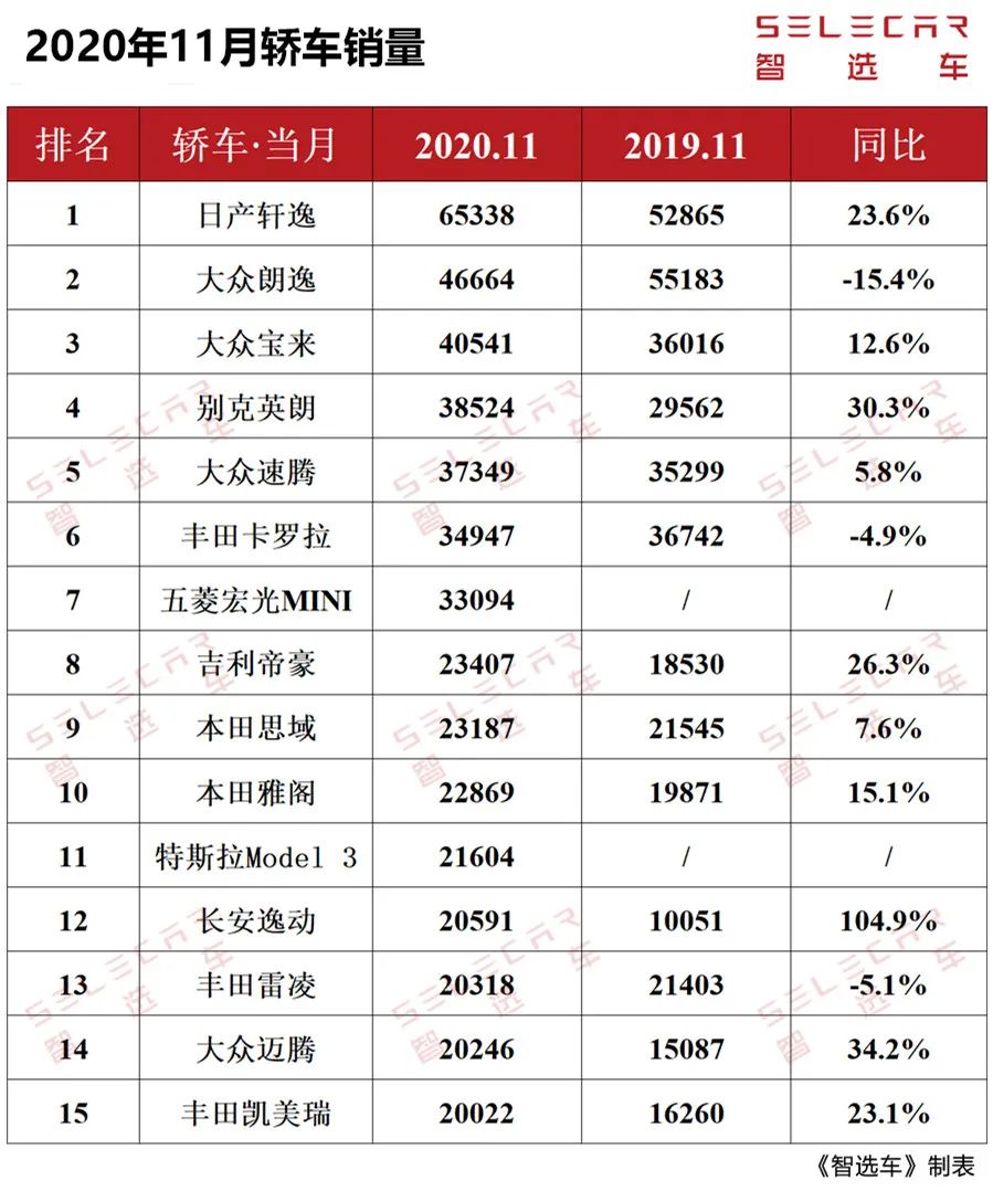 好了,以上就是笔者对11月轿车销量的解读,可以看出前15名的变化还是比较大的。特别是五菱宏光MINIEV排到了第7名,这是纯电动车前所未有的高度。而且特斯拉Model 3的销量表现也很强势,挤进前10名感觉是早晚的事。对于11月轿车销量,你有什么想说的,欢迎在下方评论留言。