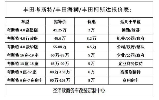 丰田考斯特12座报价考斯特【12座价格】。丰田考斯特改装商务车从座位的数量上来说具有具有从10座到23座不同的设计,而我们可以根据自己选择考斯特的用途来设计内饰空间的座椅数量以及座位的布局。在某种意义上来说丰田考斯特改装商务车就是完成我们个人的私人订制,我们可以依靠自己的想法去设定车内的一事一物。从丰田考斯特的质量上来说,丰田考斯特生产于四川一汽,属于国产车的系列,但是质量却是毋庸置疑的,而国产的丰田考斯特在发动机的设置上比进口的考斯特更加强大。