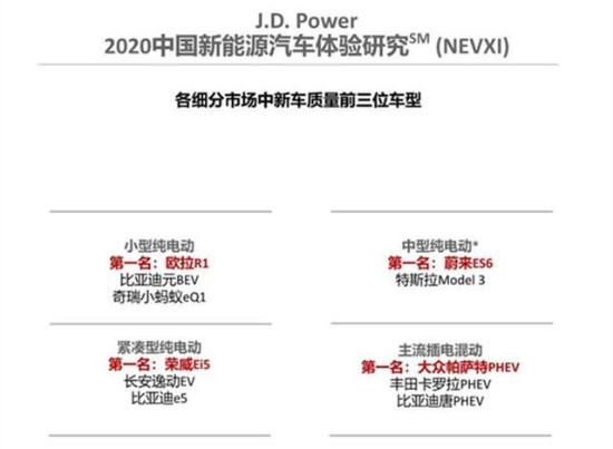 另外,在细分市场中,J.D. Power也给出了部分排名。其中,小型纯电动领域,欧拉R1斩获第一,比亚迪元、奇瑞小蚂蚁分别位居第二、第三;在紧凑型纯电动领域,荣威Ei5遥遥领先,长安逸动、比亚迪e5分别为第二、第三;在中型纯电动领域,蔚来ES6排名第一,特斯拉Model 3仅次其后。