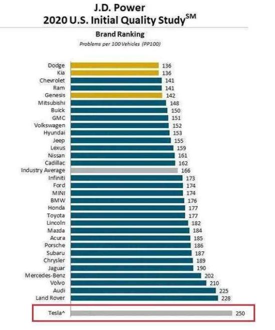另外,J.D. Power于今年6月份发布了2020年新车质量调查报告。其中,特斯拉以“每100辆车会出现250个问题”的成绩垫底。统计方法同样是通过对美国50个州内购买新车90天后的车主进行调查,通过收集数据,按照每100辆车出现的问题数量(PP100)作为质量排名的统计结果。公布的报告显示,每100辆特斯拉汽车存在250个问题,远高于166个的行业平均水平,在榜单中处于垫底位置。