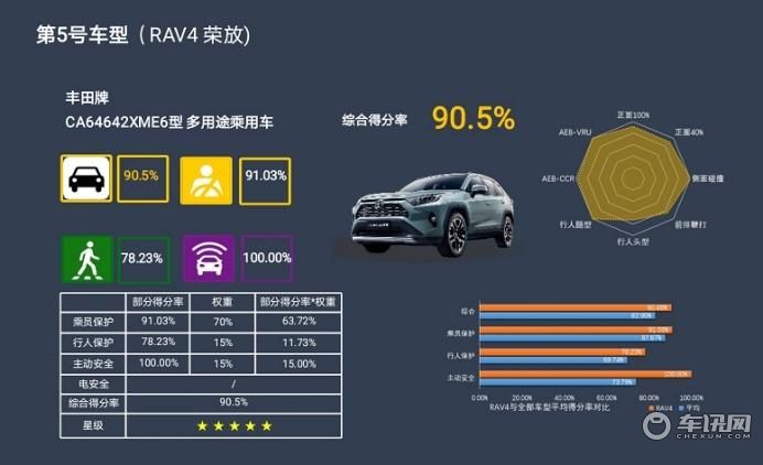 而在SUV方面,全新RAV4荣放借助TNGA架构,安全性再创新高。早在2019年欧洲E-NCAP碰撞试验中,全新一代丰田RAV4获得了五星评分,更在今年8月份完成了C-NCAP的全部碰撞测试,最终以综合得分率90.5%荣获五星评价,这样的成绩也让全新RAV4荣放的安全性能在同级车型中格外亮眼。