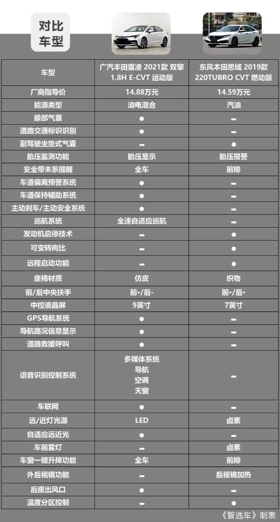 消费者买车最在乎的还是配置,所以在本次对比中,小智选择了官方指导价为14.88万元的雷凌 2021款 双擎 1.8H E-CVT 运动版和官方指导价为14.59万元的思域 2019款 220TUBRO CVT 燃动版进行对比,看看哪款车型更值得买。