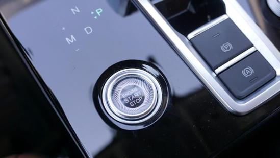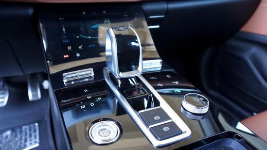 电子挡把造型精致,后方设计有一键启动按钮、电子驻车和多媒体音量调节按钮,电子挡把的右侧为360°全景影像、发动机启停、车辆设置、驾驶模式和驻车雷达的控制按钮,均为触控设计。