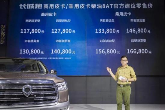 10月14日,在2020沈阳国际汽车展览会上,长城炮柴油8AT全系车型登场。其中,长城炮商用皮卡柴油8AT售价区间为11.78万-14.08万元,乘用皮卡柴油8AT售价区间为13.38万-16.68万元,越野皮卡柴油8AT售价区间为17.68万-20.68万元。
