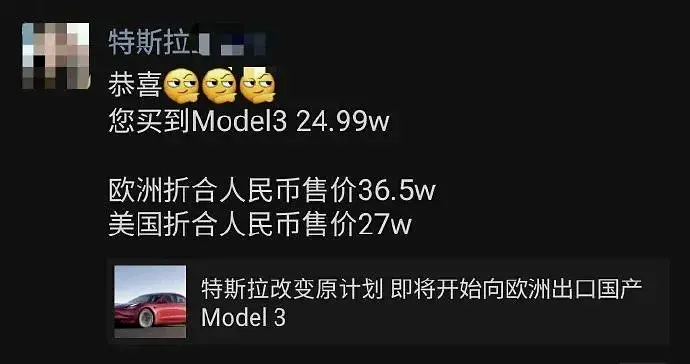 先不管特斯拉的再一次出尔反尔,我们看它家销售在朋友圈的表态:您买到的Model 3 24.99万,欧洲合人民币36.5万,美国合人民币27万。