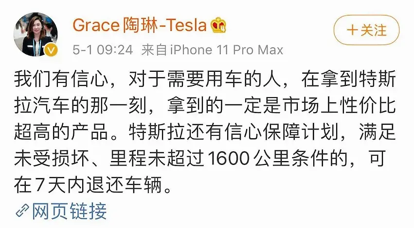 特斯拉对外事务副总裁陶琳,为此事连发数条微博“澄清”,称特斯拉是在为中国消费者做好事,并不存在任何隐瞒信息。