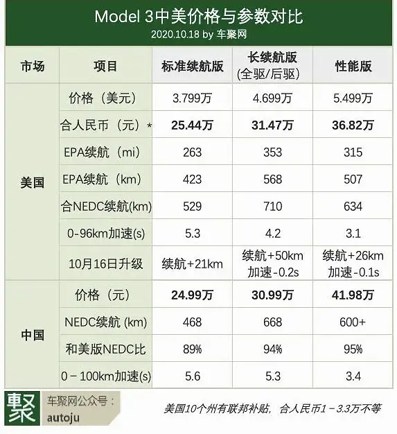 车聚君觉得有必要查证一下。毕竟登陆一下特斯拉美国官网也不难。于是用公开信息总结了一张对比表,如下: