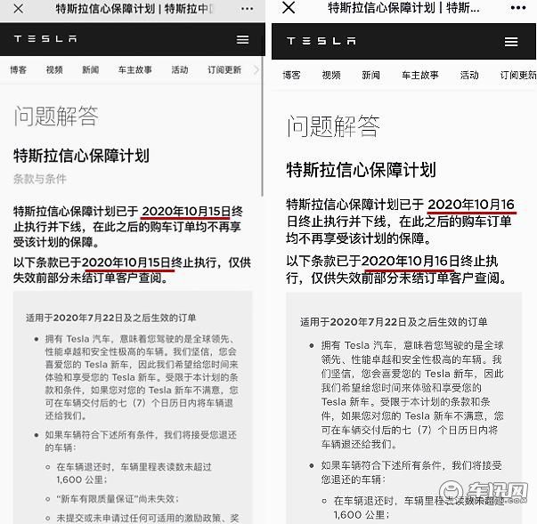 10月17日,特斯拉官网显示,7天退车信心计划于10月15日终止执行。诡异的是,很快又改成于10月16日终止执行。