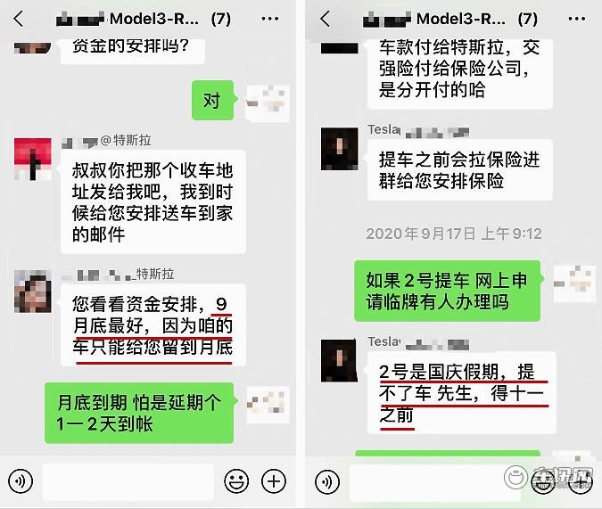 另一位威海的李先生,因为资金原因,本来想在国庆期间提车。但是在微信群中,特斯拉的销售和交付人员轮番“劝告”,称国庆节提不了,他定的车只能留到9月底。