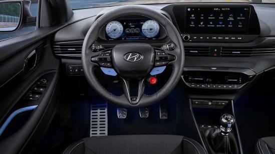 内饰方面,则与普通版的i20保持一致,整体比较简洁规整,采用了黑色的配色,并且配有一体式运动座椅、三辐式运动方向盘、金属踏板、独特样式的仪表盘等。