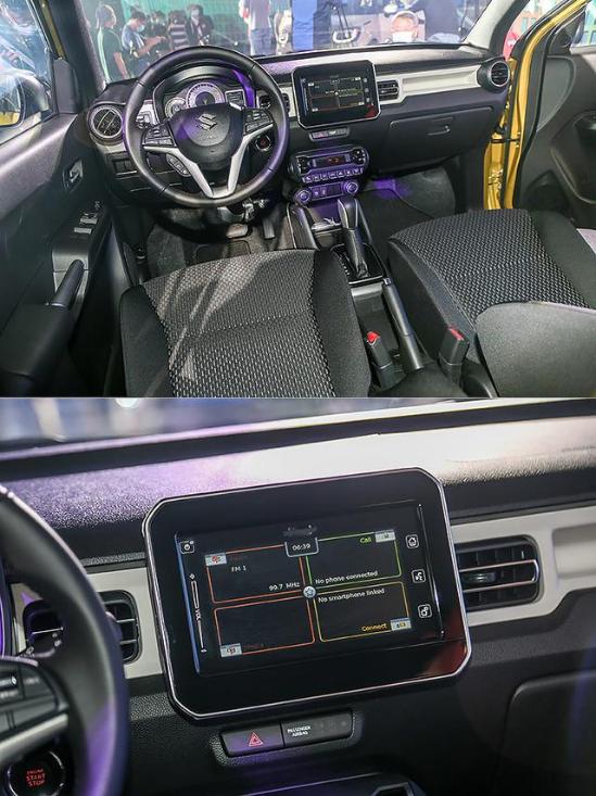 内饰方面,小改款 Ignis 的控台布局与改款前大致相同,同样维持以水平线条延伸出的车室空间,但取消了小改款前的上下双层白、黑内饰配色处理;而是改以大面积的黑色塑料为主,并以新式样的白色饰板水平贯穿控台一分为二,带来更具时尚简约的质感。另外,针对车身色为黑色、蓝色、白色的标准色车款,内装多处皆采用蓝色金属漆中央鞍座饰板、蓝色车门把手、蓝色座椅缝线;至于 Two-Tone 双色外观色车款,则是在上述部分改采银色涂装处理。方向盘处则也首度新增了换档拨片的配置。