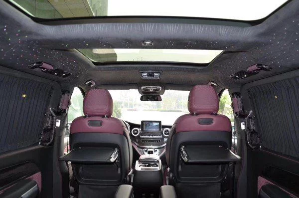 后排三座采用的是电动三连坐沙发座椅,支持电动一键平躺,座椅变大床只需要一秒。后舱为了照顾到没有像全隔断设计那样较好的私密性,V260设计了电动遮光窗帘,让整个空间能够不被外界轻易看到。这款车就是后舱二座的座椅可以旋转,这样后·就能很便捷的形成一个·商务谈判的局面。